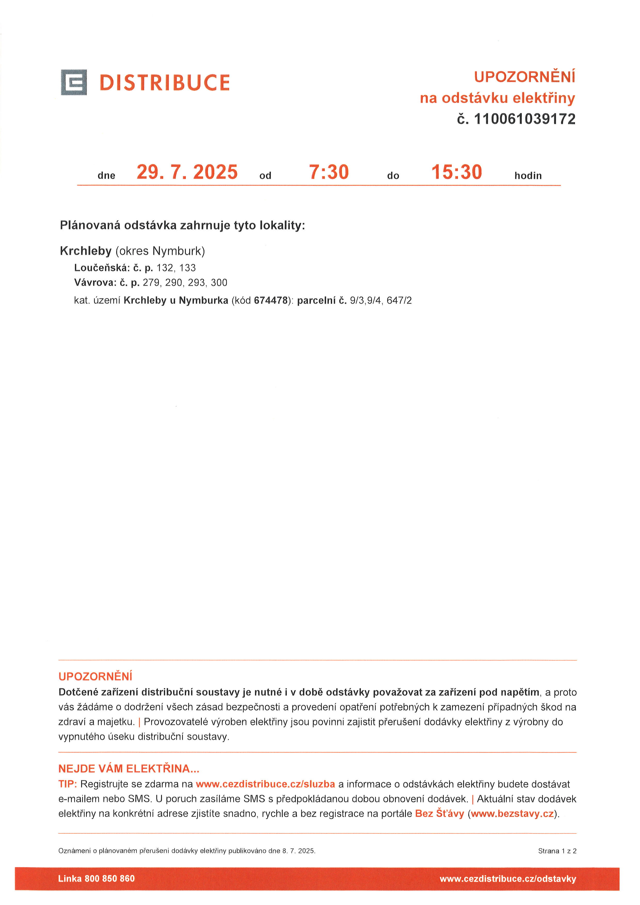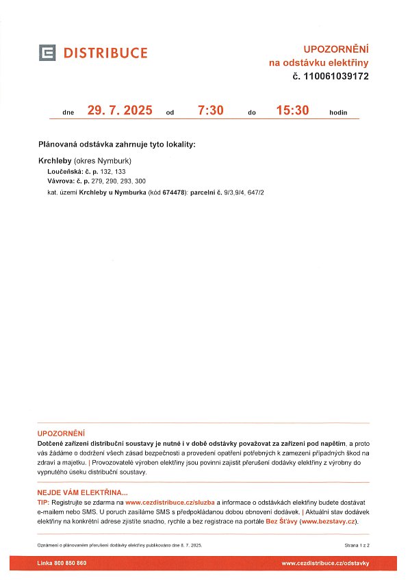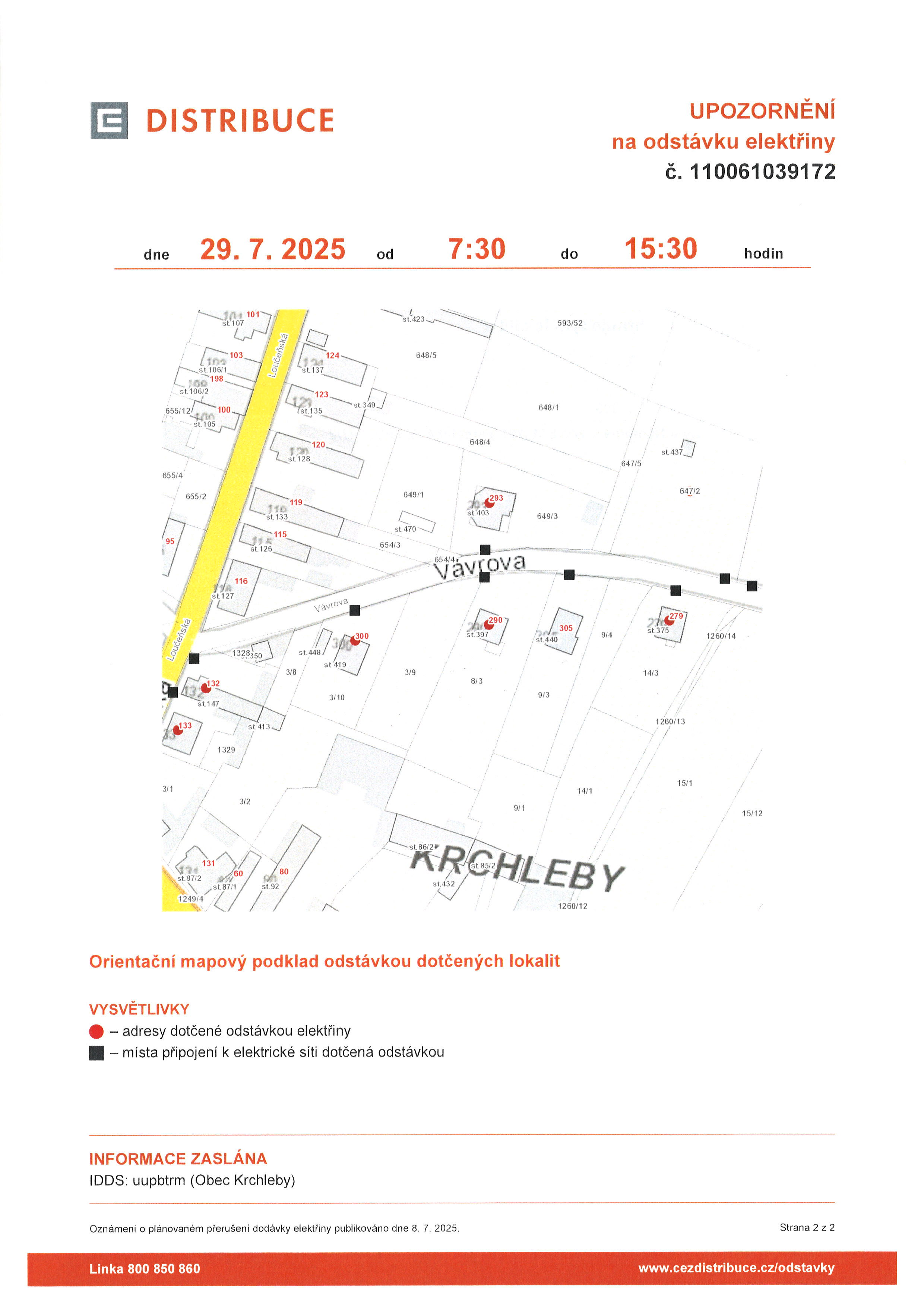 Oznámení o přerušení dodávky elektrické energie 29.7.2025.jpg Oznámení o přerušení dodávky elektrické energie 29.7.2025 - mapa.jpg